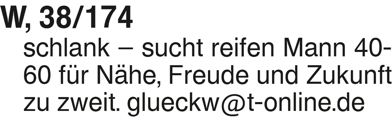 W, 38/174 schlank # sucht schlank # sucht reifen Mann 40-60 für Nähe, Freude und Zukunft zu zweit. glueckw@t-online.deDas könnte Sie auch interessieren
