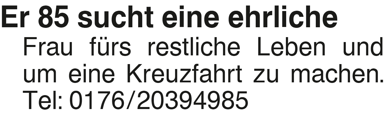Kreuzfahrt Er 85 sucht eine ehrliche Frau fürs restliche Leben und um eine Kreuzfahrt zu machen. Tel: 0176/20394985Das könnte Sie auch interessieren