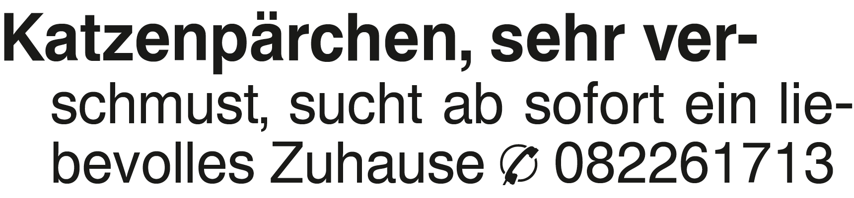 Katzenpärchen, sehr ver- Katzenpärchen, sehr ver- schmust, sucht ab sofort ein liebevolles Zuhause 082261713Das könnte Sie auch interessieren