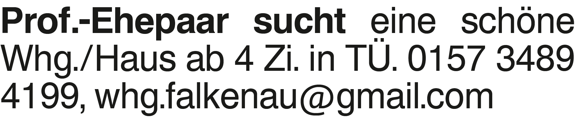Ein Prof.-Ehepaar sucht e Prof.-Ehepaar sucht eine schöne Whg./Haus ab 4 Zi. in TÜ. 0157 3489 4199, whg.falkenau@gmail.comDas könnte Sie auch interessieren