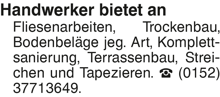 Handwerker bietet an Flie Handwerker bietet an Fliesenarbeiten, Trockenbau, Bodenbeläge jeg. Art, Komplettsanierung, Terrassenbau, Streichen und Tapezieren. (0152) 37713649.Das könnte Sie auch interessieren