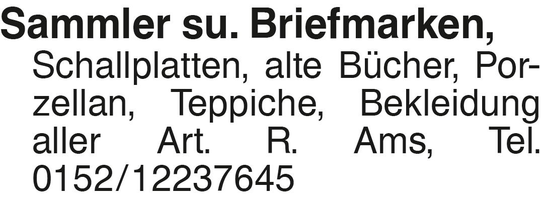 Sammler su. Briefmarken, Sammler su. Briefmarken, Schallplatten, alte Bücher, Porzellan, Teppiche, Bekleidung aller Art. R. Ams, Tel. 0152/12237645Das könnte Sie auch interessieren