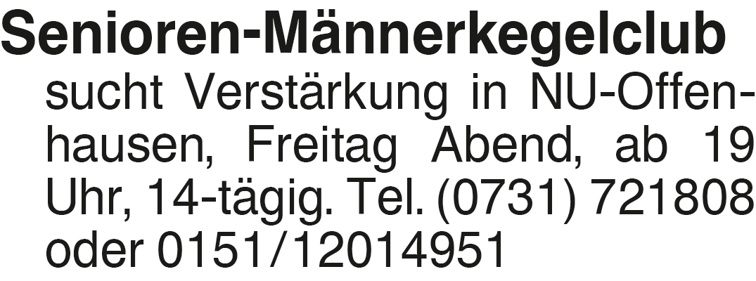 Senioren-Männerkegelclub Senioren-Männerkegelclub sucht Verstärkung in NU-Offenhausen, Freitag Abend, ab 19 Uhr, 14-tägig. Tel. (0731) 721808 oder 0151/12014951Das könnte Sie auch interessieren