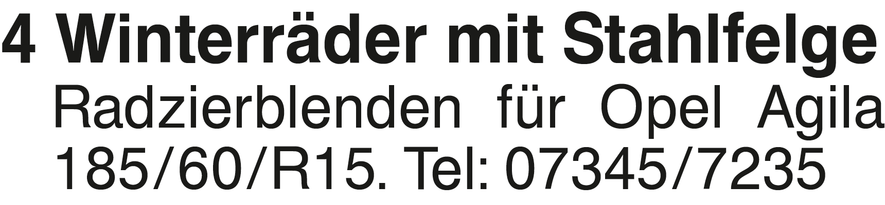 Winterräder mit Felgen 4 Winterräder mit Stahlfelge Radzierblenden für Opel Agila 185/60/R15. Tel: 07345/7235Das könnte Sie auch interessieren