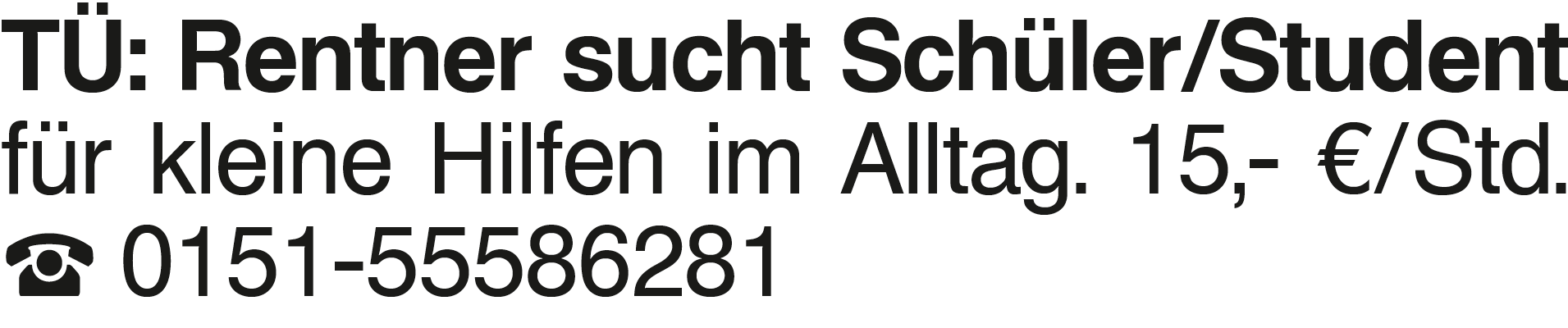 TÜ: Rentner sucht Schüler/Student TÜ: Rentner sucht Schüler/Student für kleine Hilfen im Alltag. 15,- EUR/Std. 0151-55586281Das könnte Sie auch interessieren