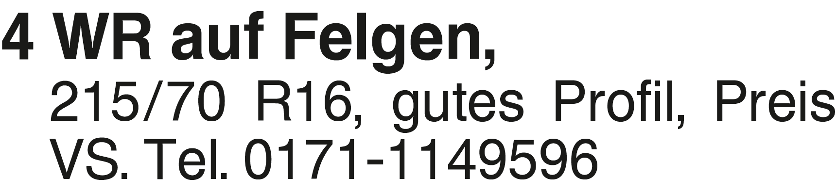 4 WR auf Felgen, 215/70 R 4 WR auf Felgen, 215/70 R16, gutes Profil, Preis VS. Tel. 0171-1149596Das könnte Sie auch interessieren