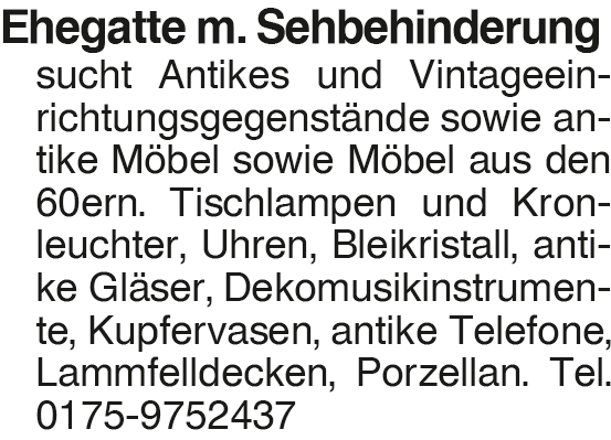 Ehegatte m. Sehbehinderun Ehegatte m. Sehbehinderung sucht Antikes und Vintageeinrichtungsgegenstände sowie antike Möbel sowie Möbel aus den 60ern. Tischlampen und Kronleuchter, Uhren, Bleikristall, antike Gläser, Dekomusikinstrumente, Kupfervasen, antike Telefone, Lammfelldecken, Porzellan. Tel. 0175-9752437Das könnte Sie auch interessieren