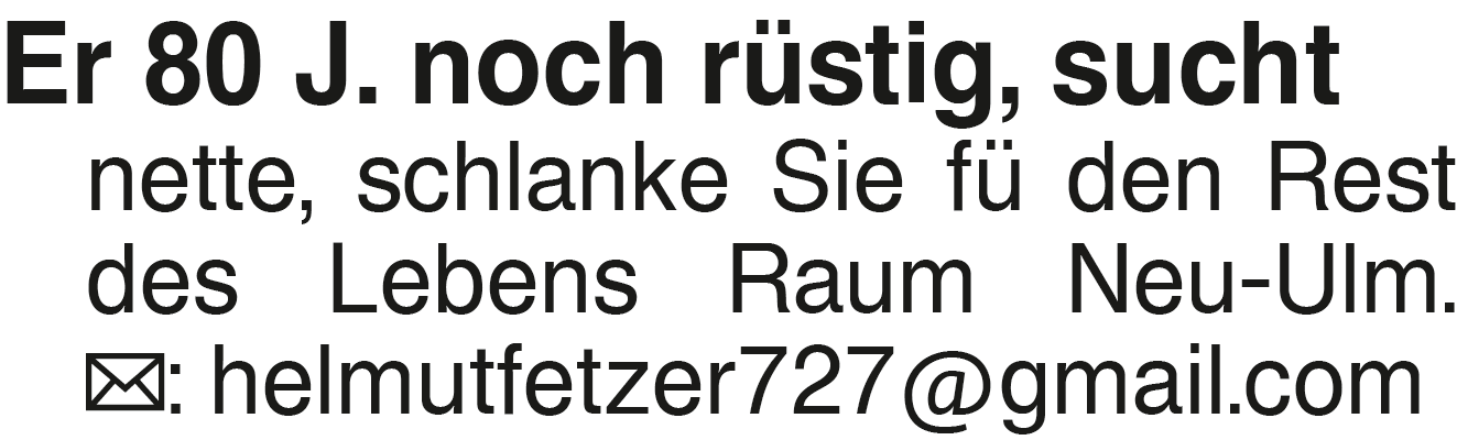 Bekanntschaft Er 80 J. noch rüstig, sucht nette, schlanke Sie fü den Rest des Lebens Raum Neu-Ulm. : helmutfetzer727@gmail.comDas könnte Sie auch interessieren