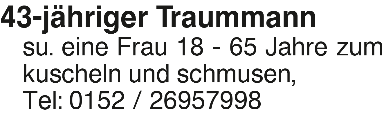 43 jähriger Traummann su. 43-jähriger Traummann su. eine Frau 18 - 65 Jahre zum kuscheln und schmusen, Tel: 0152 / 26957998Das könnte Sie auch interessieren