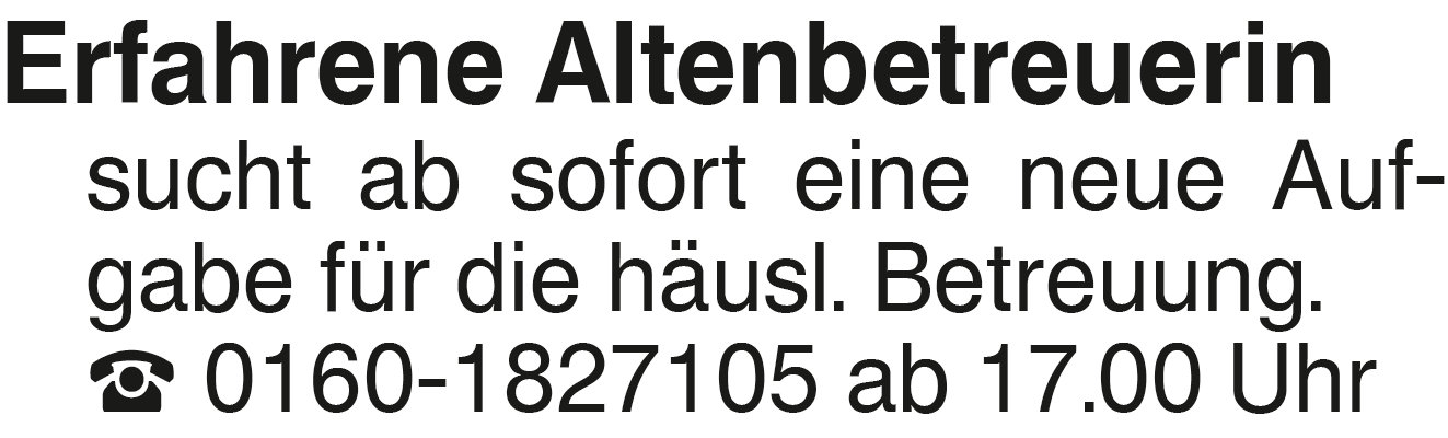 Erfahrene Altenbetreuerin Erfahrene Altenbetreuerin sucht ab sofort eine neue Auf gabe für die häusl. Betreuung. 0160-1827105 ab 17.00 UhrDas könnte Sie auch interessieren