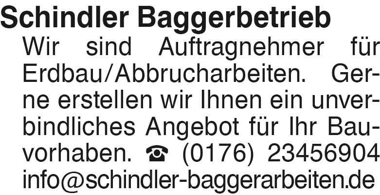 Schindler Baggerbetrieb W Wir sind Auftragnehmer für Erdbau/Abbrucharbeiten. Gerne erstellen wir Ihnen ein unverbindliches Angebot für Ihr Bauvorhaben. Tel. 0176/23456904 info@schindler-baggerarbeiten.deDas könnte Sie auch interessieren