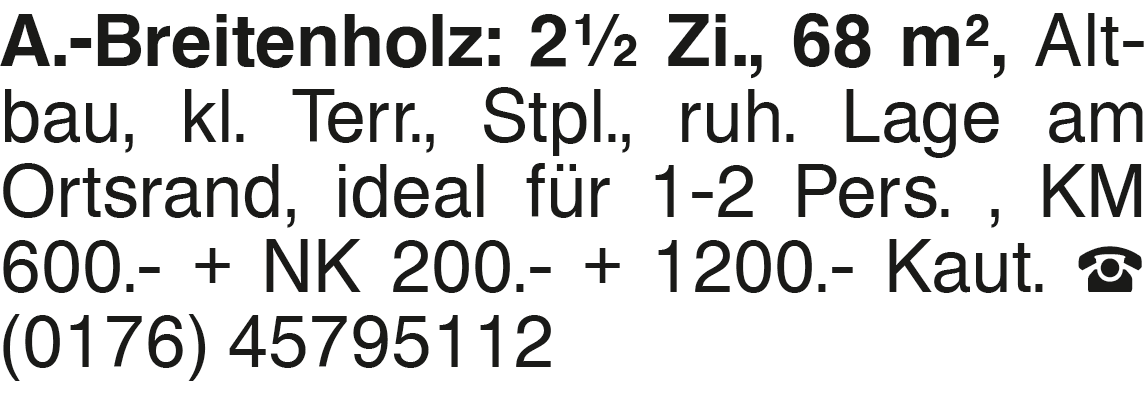 A.-Breitenholz: 2 1/2-Zi. A.-Breitenholz: 2 1/2 Zi., 68 m2, Altbau, kl. Terr., Stpl., ruh. Lage am Ortsrand, ideal für 1-2 Pers. , KM 600.- + NK 200.- + 1200.- Kaut. (0176) 45795112Das könnte Sie auch interessieren
