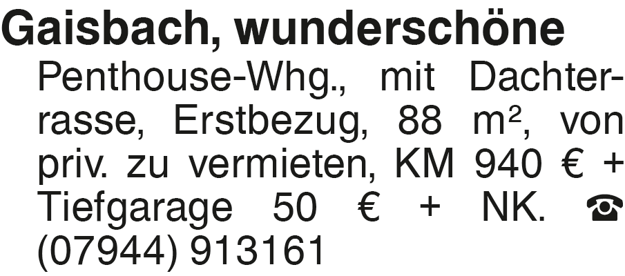 Gaisbach, wunderschöne Pe Gaisbach, wunderschöne Penthousewohnung mit Dachterrasse 0-Zi.-Whg., 88 m2 Wfl., 980 EUR KM,Das könnte Sie auch interessieren