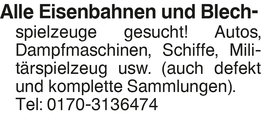 Alle Eisenbahnen und Blec Alle Eisenbahnen und Blech- spielzeuge gesucht! Autos, Dampfmaschinen, Schiffe, Militärspielzeug usw. (auch defekt und komplette Sammlungen). Tel: 0170-3136474Das könnte Sie auch interessieren