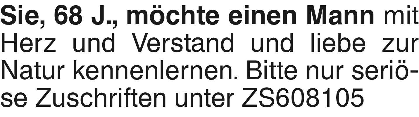 Frau, 67 J., bodenständig Sie, 68 J., möchte einen Mann mit Herz und Verstand und liebe zur Natur kennenlernen. Bitte nur seriöse Zuschriften unter ZS608105Das könnte Sie auch interessieren