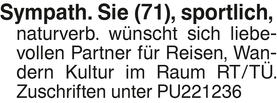 Sympath. Sie (71), sportl Sympath. Sie (71), sportlich, naturverb. wünscht sich liebevollen Partner für Reisen, Wandern Kultur im Raum RT/TÜ. Zuschriften unter PU221236Das könnte Sie auch interessieren