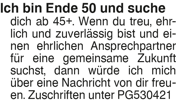 Ich bin Ende 50 und suche Bin ein junggebliebener treuer Bursche ohne Altlasten. Wünsche mir nicht nur zu diesem Ostern liebe, humorvolle u. ehrliche Partnerin. Freue mich auf deine Zuschrift!Das könnte Sie auch interessieren
