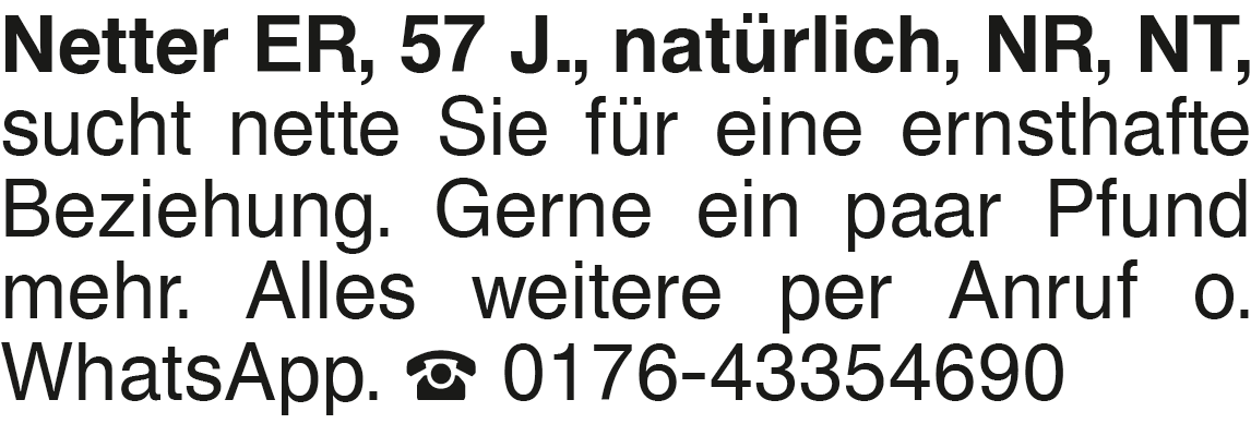 Netter ER, 57 J., natürlich Netter ER, 57 J., natürlich, NR, NT, sucht nette Sie für eine ernsthafte Beziehung. Gerne ein paar Pfund mehr. Alles weitere per Anruf o. WhatsApp. 0176-43354690Das könnte Sie auch interessieren