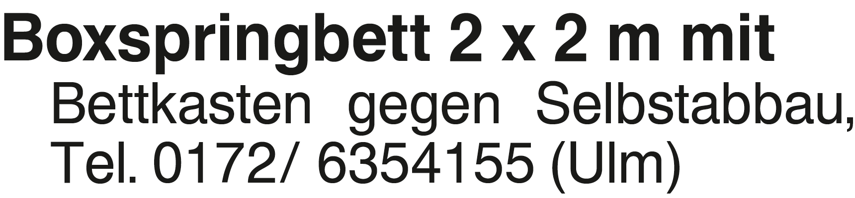 Boxspringbett 2 x 2 m mit Boxspringbett 2 x 2 m mit Bettkasten gegen Selbstabbau, Tel. 0172/ 6354155 (Ulm)Das könnte Sie auch interessieren