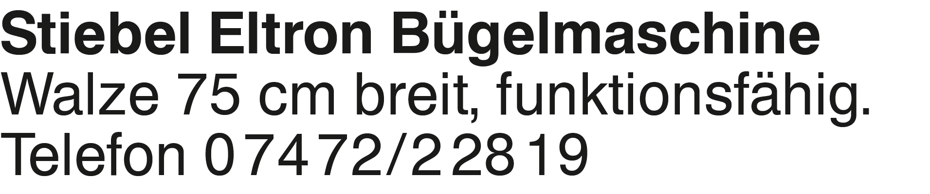 Stiebel Eltron Bügelmaschine Stiebel Eltron Bügelmaschine Walze 75 cm breit, funktionsfähig. Telefon 0 74 72/2 28 19Das könnte Sie auch interessieren