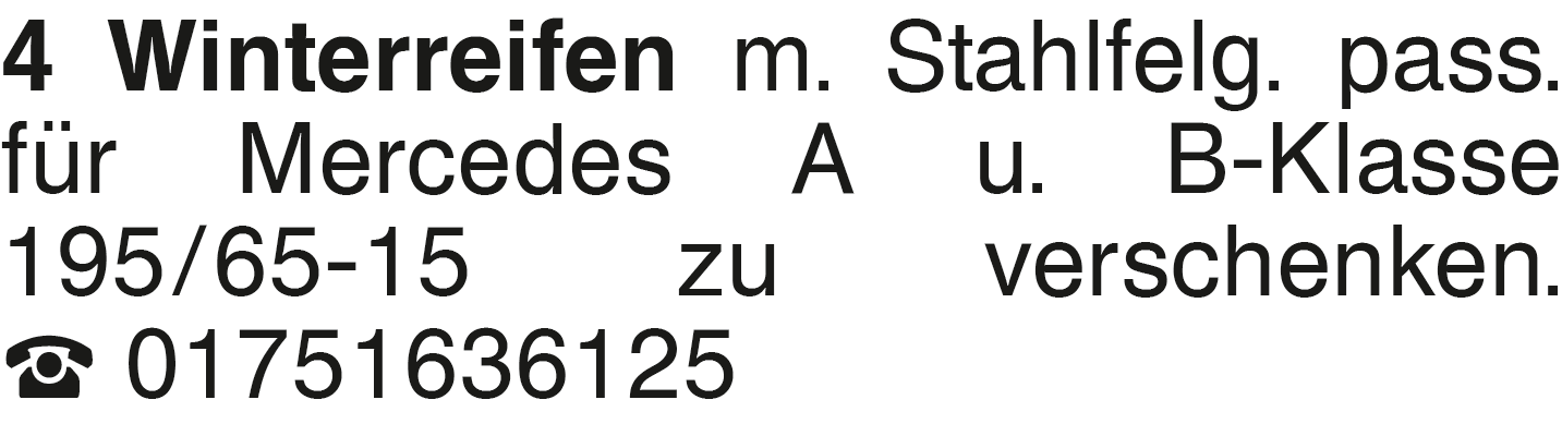 4 Winterreifen m. Stahlfe 4 Winterreifen m. Stahlfelg. pass. für Mercedes A u. B-Klasse 195/65-15 zu verschenken. 01751636125Das könnte Sie auch interessieren