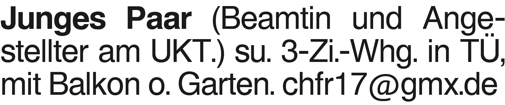 Junges Paar (Beamtin und Junges Paar (Beamtin und Angestellter am UKT.) su. 3-Zi.-Whg. in TÜ, mit Balkon o. Garten. chfr17@gmx.deDas könnte Sie auch interessieren