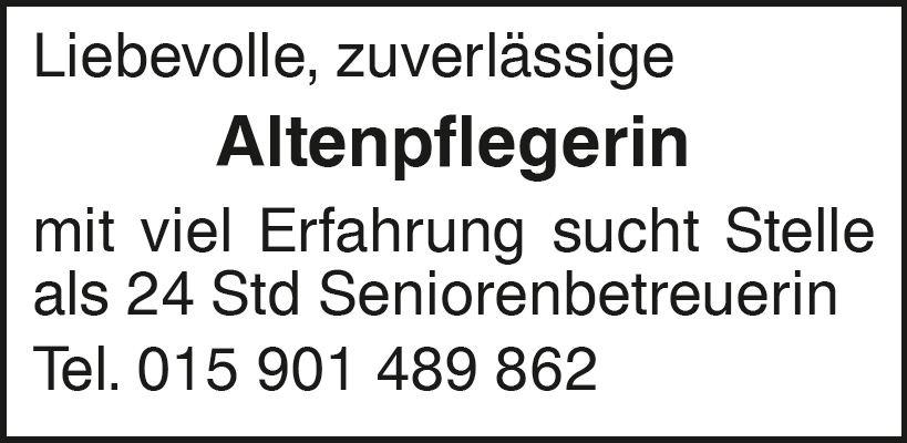 Liebevolle, zuverlässige mit Erfahrung sucht Stelle als 24 Std Senioren Betreuerin Tel. 0159-01489862