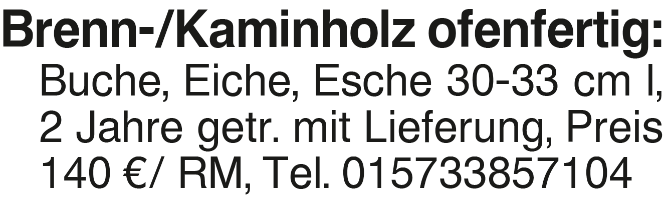 Brenn-/Kaminholz ofenfert Brenn-/Kaminholz ofenfertig: Buche, Eiche, Esche 30-33 cm l, 2 Jahre getr. mit Lieferung, Preis 140 EUR/ RM, Tel. 015733857104Das könnte Sie auch interessieren