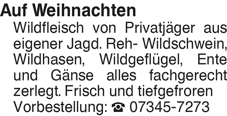 Auf Weihnachten Wildfleis Auf Weihnachten Wildfleisch von Privatjäger aus eigener Jagd. Reh- Wildschwein, Wildhasen, Wildgeflügel, Ente und Gänse alles fachgerecht zerlegt. Frisch und tiefgefroren Vorbestellung: 07345-7273Das könnte Sie auch interessieren