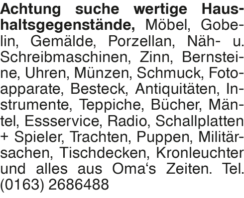 Achtung suche wertige Hau Achtung suche wertige Haushaltsgegenstände, Möbel, Gobelin, Gemälde, Porzellan, Näh- u. Schreibmaschinen, Zinn, Bernsteine, Uhren, Münzen, Schmuck, Fotoapparate, Besteck, Antiquitäten, Instrumente, Teppiche, Bücher, Mäntel, Essservice, Radio, Schallplatten + Spieler, Trachten, Puppen, Militärsachen, Tischdecken, Kronleuchter und alles aus Oma s Zeiten. Tel. (0163) 2686488Das könnte Sie auch interessieren