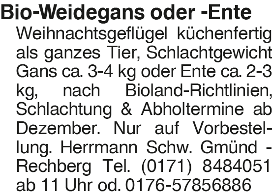 Bio-Weidegans oder -Ente Weihnachtsgeflügel küchenfertig als ganzes Tier, Schlachtgewicht Gans ca.3-4kg oder Ente ca. 2-3kg, nach Bioland-Richtlinien, Schlachtung & Abholtermine ab Dezember. Nur auf Vorbestellung. Herrmann Schw. Gmünd-Rechberg Tel. (0171) 8484051 ab 11 Uhr od. 0176-57856886Das könnte Sie auch interessieren