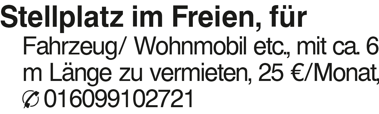 Stellplatz im Freien, für Stellplatz im Freien, für Fahrzeug/ Wohnmobil etc., mit ca. 6 m Länge zu vermieten, 25 EUR/Monat, 016099102721Das könnte Sie auch interessieren