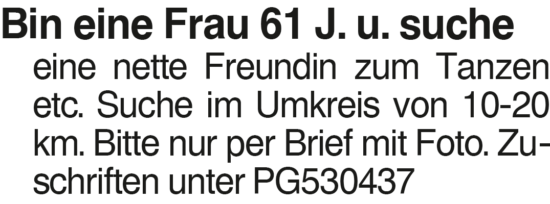 Bin eine Frau, 61 J. u. s Bin eine Frau 61 J. u. suche eine nette Freundin zum Tanzen etc. Suche im Umkreis von 10-20 km. Bitte nur per Brief mit Foto. Zuschriften unter PG530437Das könnte Sie auch interessieren