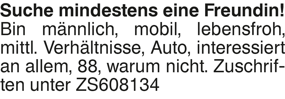 Suche mindestens eine Freundin Suche mindestens eine Freundin! Bin männlich, mobil, lebensfroh, mittl. Verhältnisse, Auto, interessiert an allem, 88, warum nicht. Zuschriften unter ZS608134Das könnte Sie auch interessieren