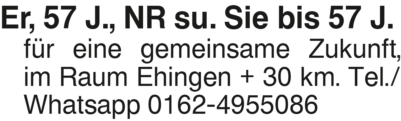 Er, 57 J., NR su. Sie bis Er, 57 J., NR su. Sie bis 57 J. für eine gemeinsame Zukunft, im Raum Ehingen + 30 km. Tel./Whatsapp 0162-4955086Das könnte Sie auch interessieren