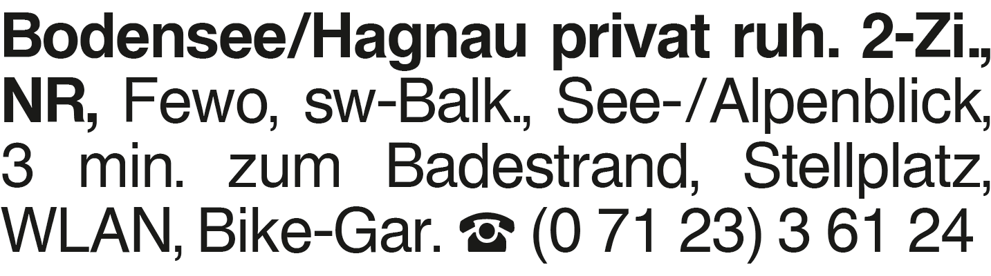 Bodensee/Hagnau privat ru Bodensee/Hagnau privat ruh. 2-Zi., NR, Fewo, sw-Balk., See-/Alpenblick, 3 min. zum Badestrand, Stellplatz, WLAN, Bike-Gar. (0 71 23) 3 61 24