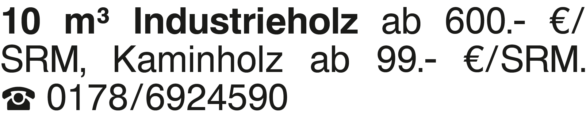 10 m3 Industrieholz 10 m3 Industrieholz ab 600.- EUR/SRM, Kaminholz ab 99.- EUR/SRM. 0178/6924590Das könnte Sie auch interessieren