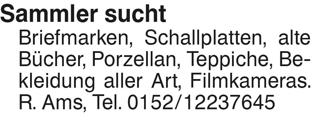 Sammler su. Briefmarken, Sammler sucht Briefmarken, Schallplatten, alte Bücher, Porzellan, Teppiche, Bekleidung aller Art, Filmkameras. R. Ams, Tel. 0152/12237645Das könnte Sie auch interessieren