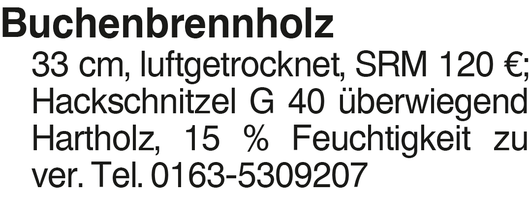 Brennholz Buche 33 cm, lu Buchenbrennholz 33 cm, luftgetrocknet, SRM 120 EUR; Hackschnitzel G 40 überwiegend Hartholz, 15 % Feuchtigkeit zu ver. Tel. 0163-5309207Das könnte Sie auch interessieren