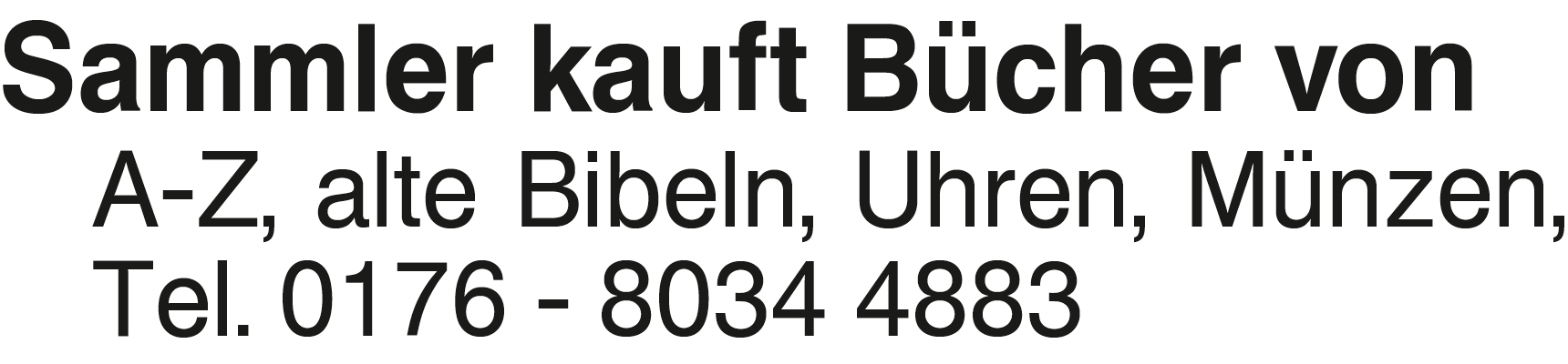 Kaufges. Sammler kauft Bücher von A-Z, alte Bibeln, Uhren, Münzen, Tel. 0176 - 8034 4883Das könnte Sie auch interessieren