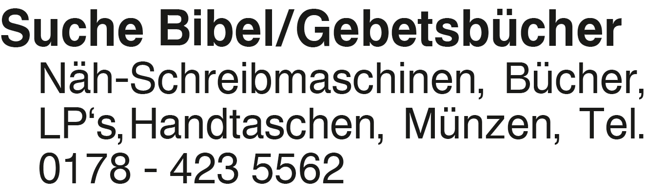 suche Bibel/Gebetsbücher Suche Bibel/Gebetsbücher Näh-Schreibmaschinen, Bücher, LP s, Handtaschen, Münzen, Tel. 0178 - 423 5562Das könnte Sie auch interessieren