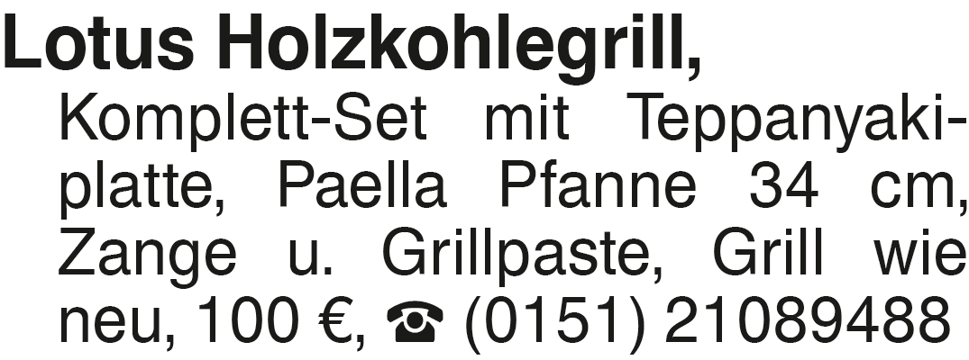 Holzkohlegrill Lotus Holzkohlegrill, Komplett-Set mit Teppanyakiplatte, Paella Pfanne 34 cm, Zange u. Grillpaste, Grill wie neu, 100 EUR, (0151) 21089488Das könnte Sie auch interessieren