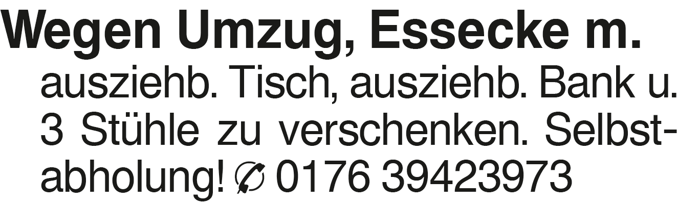 Wegen Umzug, Essecke m. a Wegen Umzug, Essecke m. ausziehb. Tisch, ausziehb. Bank u. 3 Stühle zu verschenken. Selbstabholung! 0176 39423973Das könnte Sie auch interessieren