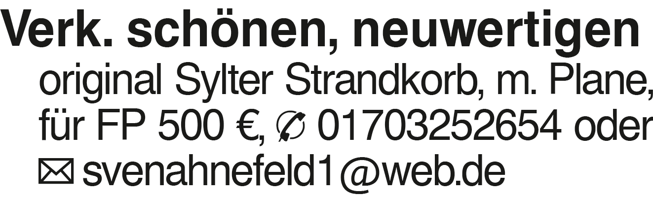 Verk. schönen, neuwertige Verk. schönen, neuwertigen original Sylter Strandkorb, m. Plane, für FP 500 EUR, 01703252654 oder svenahnefeld1@web.deDas könnte Sie auch interessieren