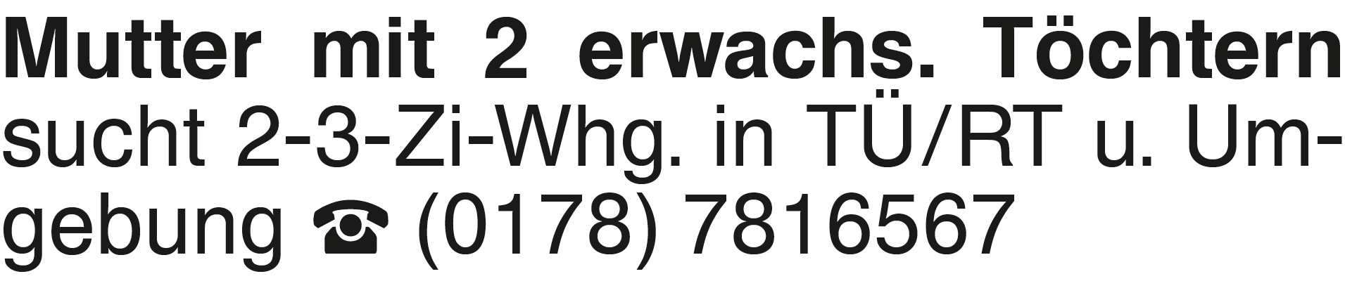 Mutter mit 2 erwachs. Töc Mutter mit 2 erwachs. Töchtern sucht 2-3-Zi-Whg. in TÜ/RT u. Umgebung (0178) 7816567Das könnte Sie auch interessieren