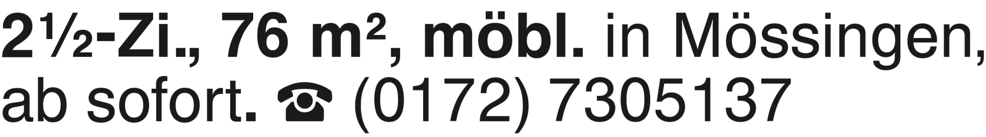2 1/2-Zi., 76 m2, möbl. i 2 1/2-Zi., 76 m2, möbl. in Mössingen, ab sofort. (0172) 7305137Das könnte Sie auch interessieren
