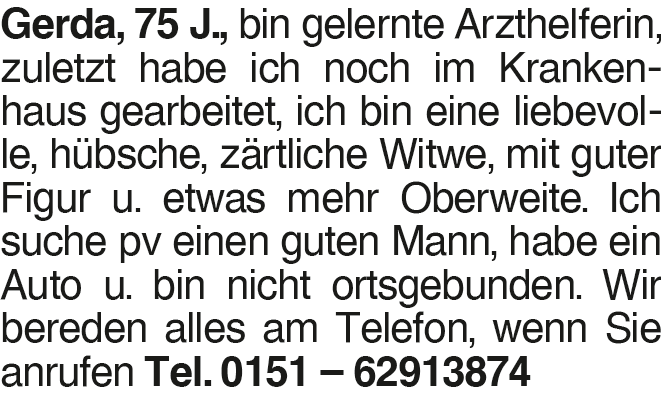Gerda, 75 J Gerda, 75 J., bin gelernte Arzthelferin, zuletzt habe ich noch im Krankenhaus gearbeitet, ich bin eine liebevolle, hübsche, zärtliche Witwe, mit guter Figur u. etwas mehr Oberweite. Ich suche pv einen guten Mann, habe ein Auto u. bin nicht ortsgebunden. Wir bereden alles am Telefon, wenn Sie anrufen Tel. 0151 # 62913874Das könnte Sie auch interessieren
