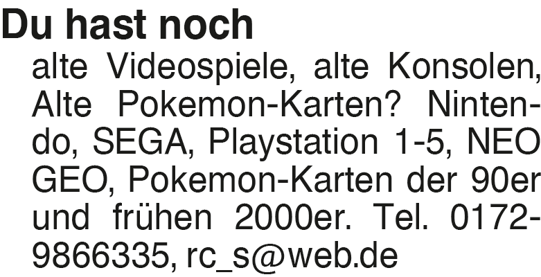 DU HAST NOCH Alte Videosp Alte Videospiele, alte Konsolen, Alte Pokemon-Karten? Ich kaufe gezielt an: Nintendo, SEGA, Playstation 1-5, NEO GEO, Pokemon Karten der 90er und frühen 2000er Tel. (0172) 9866335, rc_s@web.deDas könnte Sie auch interessieren