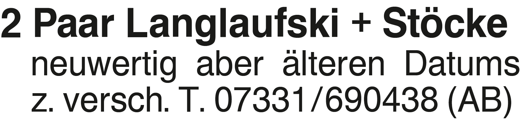 2 Paar Langlaufski + Stöc 2 Paar Langlaufski + Stöcke neuwertig aber älteren Datums z. versch. T. 07331/690438 (AB)Das könnte Sie auch interessieren