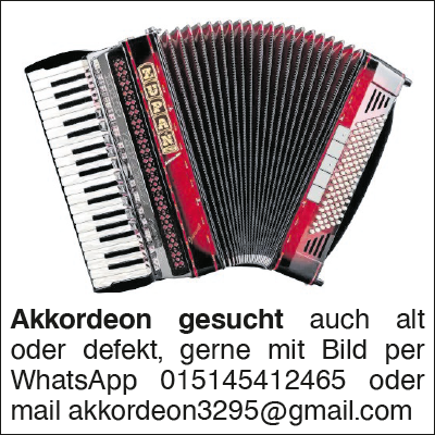 Akkordeon gesucht auch al auch alt oder defekt, gerne mit Bild per WhatsApp 015145412465 oder mail akkordeon3295@gmail.comDas könnte Sie auch interessieren